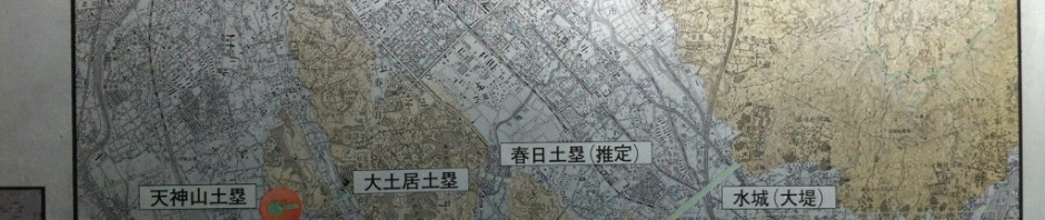 この地図では五つの土塁が記されていて、一番大きいのが水城(大堤)とあるところ。